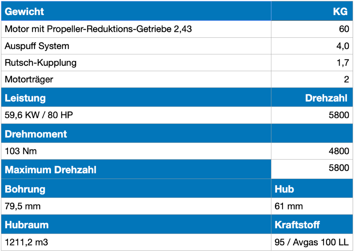 The C80 is a naturally aspirated, liquid / air cooled, horizontally opposed four-cylinder, four-stroke, gear-reduction-drive engine.